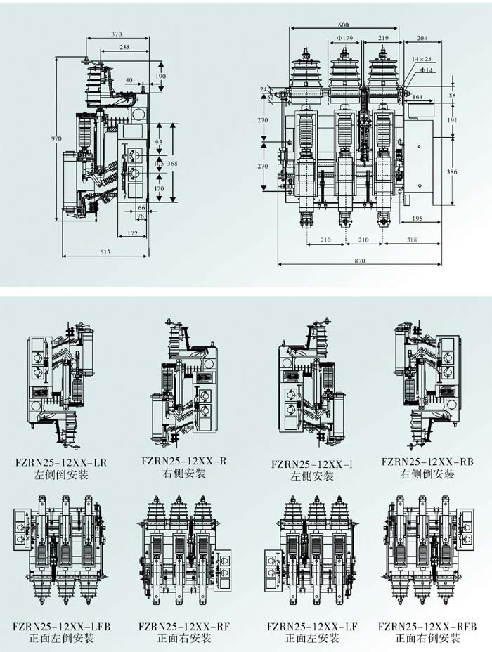 FZRN25-12型真空負(fù)荷開(kāi)關(guān)和FZRN25-12型組合電器、總體結(jié)構(gòu)采用操作機(jī)構(gòu)布置于主回路側(cè)面的形式。(可根據(jù)用戶需求提供主回路右、左側(cè)面或正面的形式)。主導(dǎo)電部分由絕緣罩、靜觸頭、活門、導(dǎo)電筒、真空滅弧室等構(gòu)成,組合電器還有限流熔斷器。