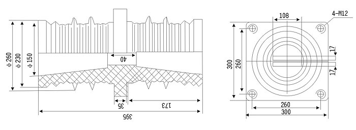 40.5KV穿墻套管為環(huán)氧樹脂APG工藝壓力凝膠成型結(jié)構(gòu),外形結(jié)構(gòu)尺寸大小為128(100×100)mm、高225mm。主要適用于額定電壓為10KV及以下的成套設(shè)備中,作絕緣隔離和聯(lián)接過(guò)度之用。套管耐污及潮濕,無(wú)需特別維護(hù),只需定期地清理表面污質(zhì)。安裝時(shí)母排從孔內(nèi)穿過(guò)。