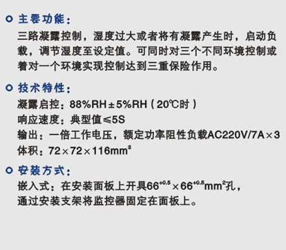 三路凝露控制,濕度過大或者將有凝露產(chǎn)生時,啟動負載,調(diào)節(jié)濕度至設(shè)定值。可同時對三個不同環(huán)境控制或者會一個環(huán)境實現(xiàn)控制達到三重保險作用。