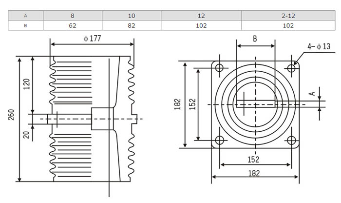 TG2-10Q套管為環(huán)氧樹(shù)脂APG工藝壓力凝膠成型結(jié)構(gòu),外形結(jié)構(gòu)尺寸大小為128(100×100)mm、高225mm。主要適用于額定電壓為10KV及以下的成套設(shè)備中,作絕緣隔離和聯(lián)接過(guò)度之用。套管耐污及潮濕,無(wú)需特別維護(hù),只需定期地清理表面污質(zhì)。安裝時(shí)母排從孔內(nèi)穿過(guò)。